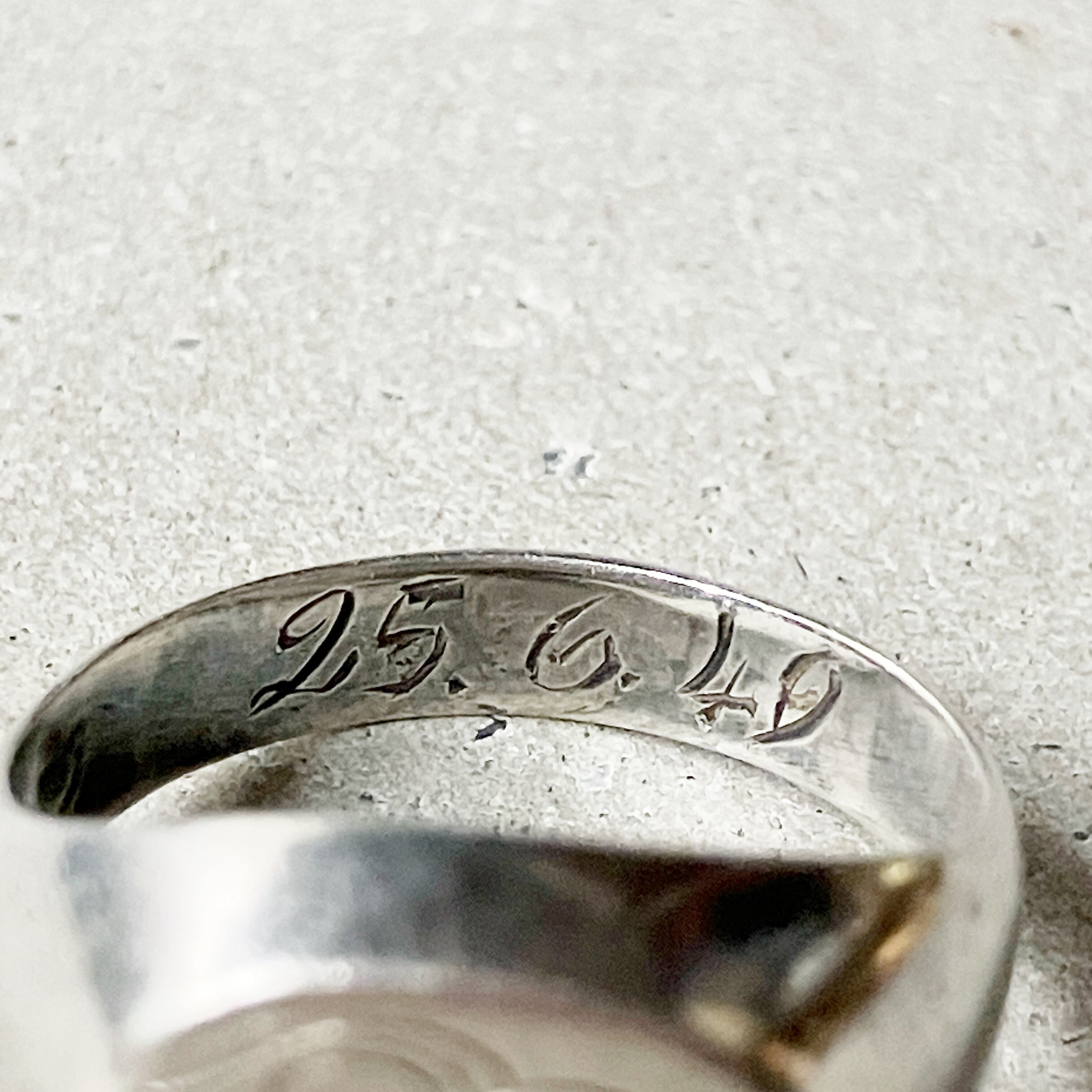 リング内側には 「25.6.49」 の刻印があり、1949年6月25日を示す記念日刻印と考えられます。大切な人生の節目を記念して作られたストーリー性のある一点物。