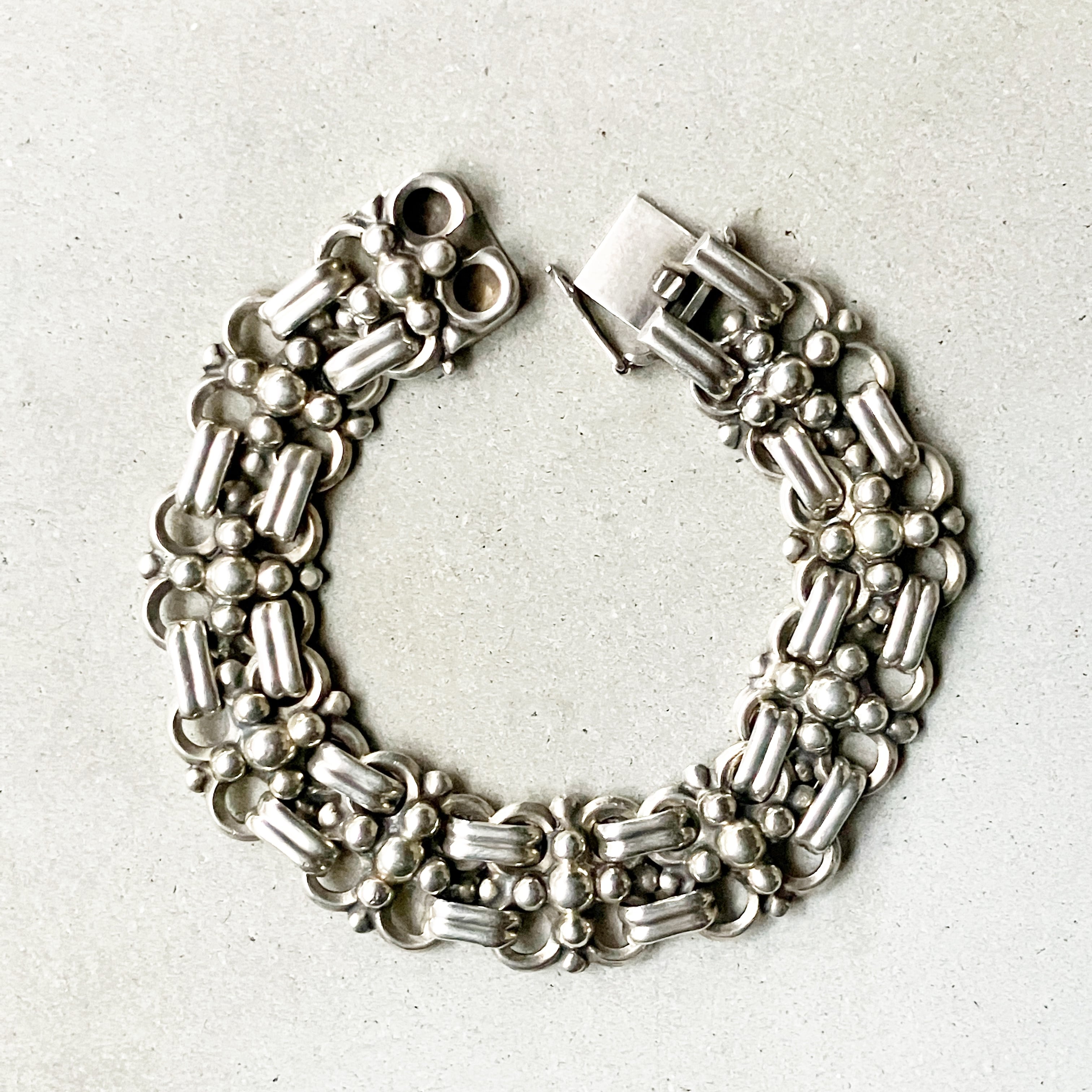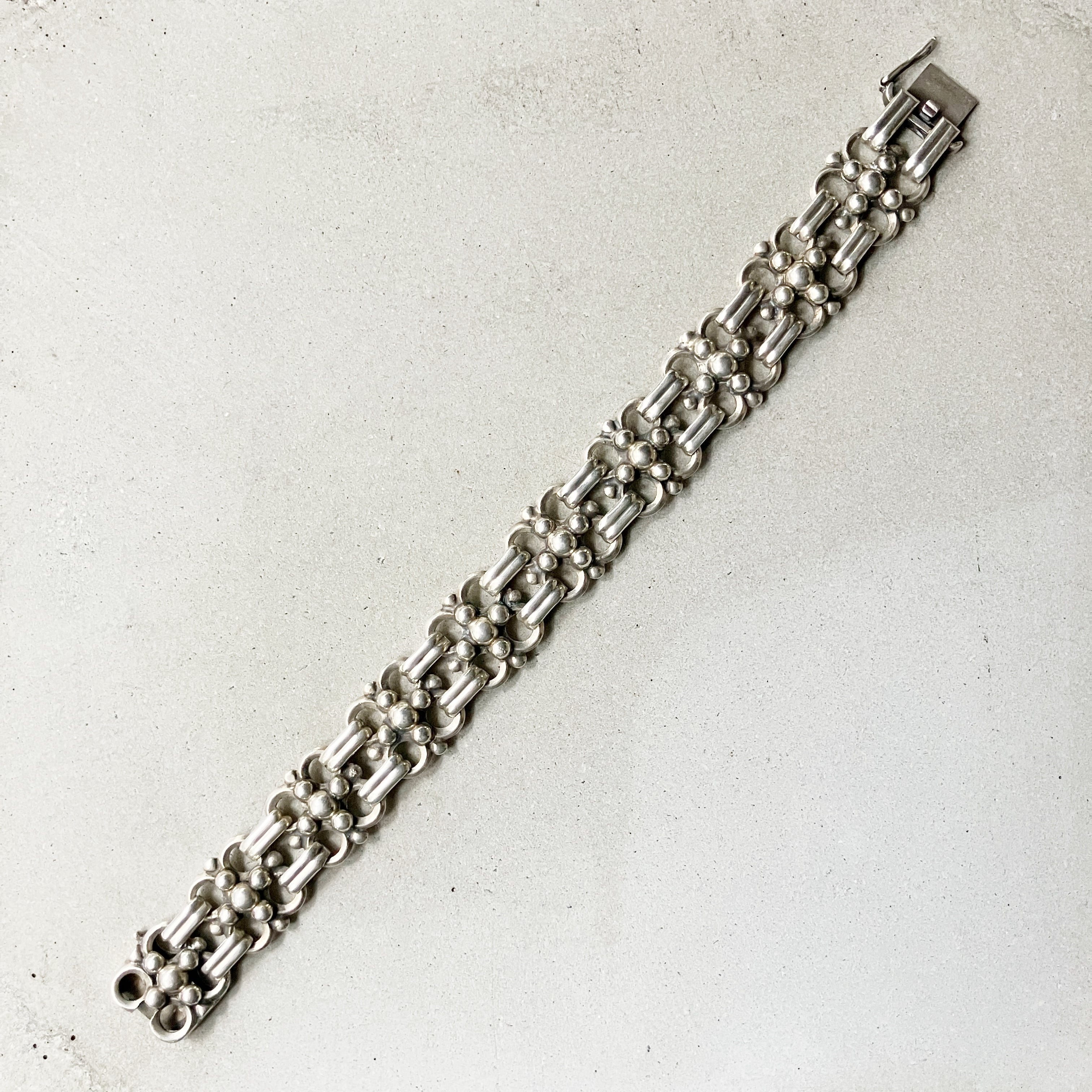 デンマーク製の830シルバーを使用したヴィンテージブレスレットです。球体パーツとバーリンクを組み合わせた立体的なデザインが特徴で、アールデコの雰囲気を感じさせる重厚感のある一本です。